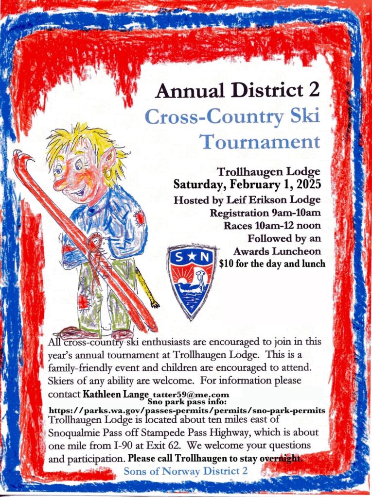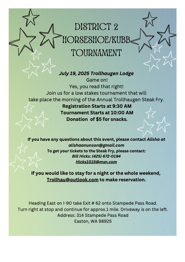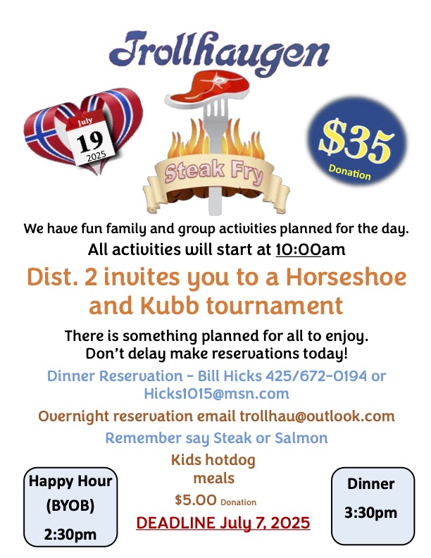 These events are: Cross Country Ski Tournament – held the 1st Saturday in February each year. Horseshoe and Kubb Tournament – held before the annual Steak Fry at Trollhugen. A Golf Tournament – date and location to be determined each year.