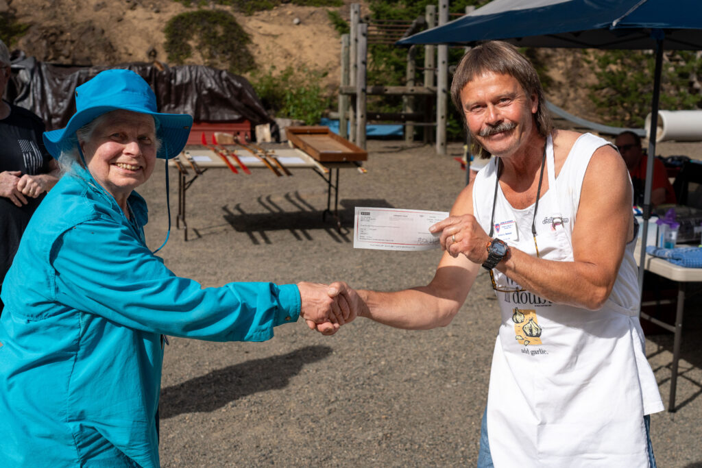 Norma Jean presents check to Erick Balstad, Chair of the Trollhaugen Board