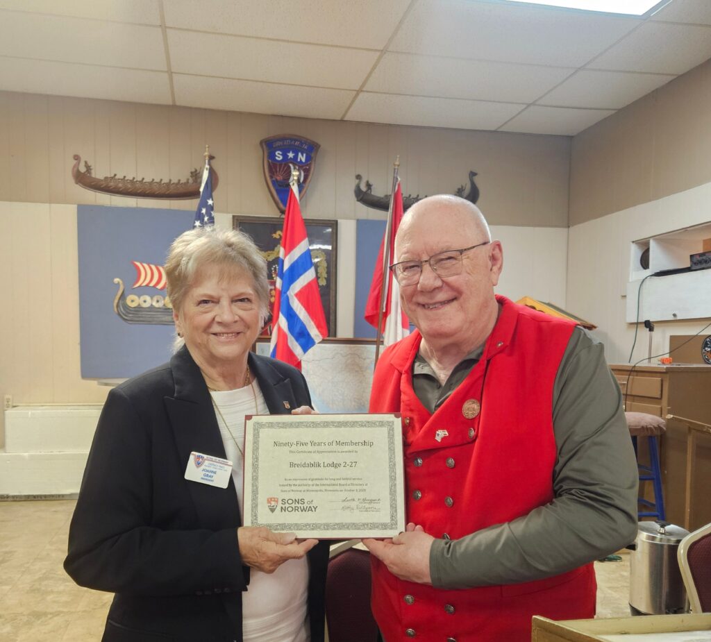 District 2 President Joanne Gray, presents certificate to Breidablik Lodge President Elmer Kurtii